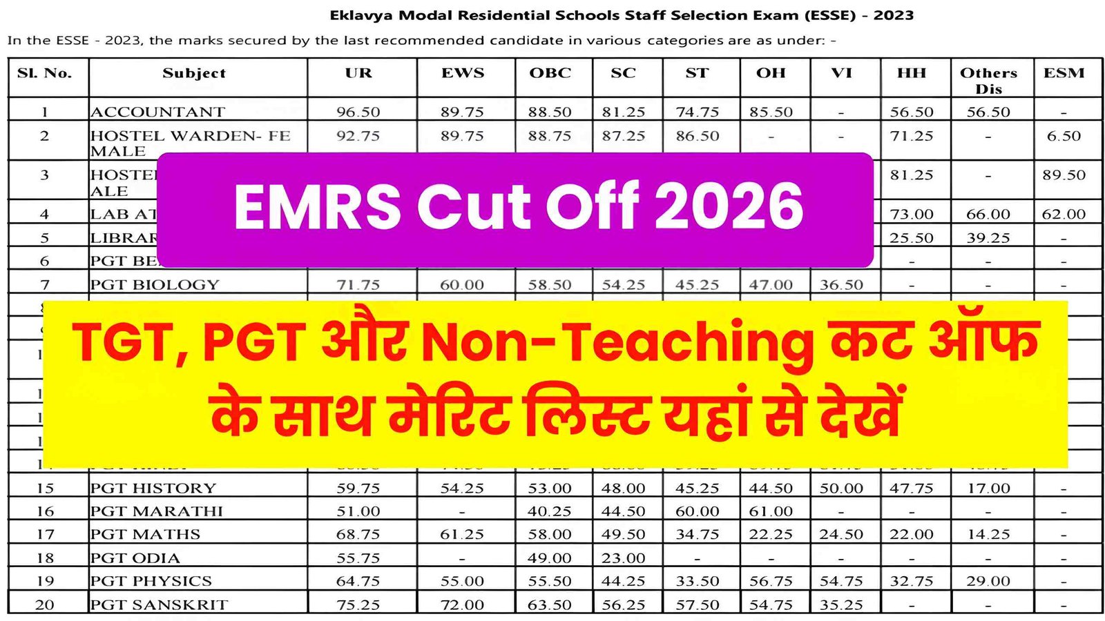 हमें पता है की आंसर की के साथ-साथ आप लोग EMRS Cut Off 2026 को लेकर गूगल और युटुब जैसे सोशल मीडिया प्लेटफॉर्म पर सर्च कर रहे हैं तो इसलिए हम इस आर्टिकल में आप लोगों को TGT, PGT और NON-TEACHING पदों की कट ऑफ और मेरिट लिस्ट की जानकारी विस्तार पूर्वक बताएंगे इसीलिए आप लोग नीचे दिए गए निर्देश को ध्यानपूर्वक पूरा जरूर पढ़ें ।