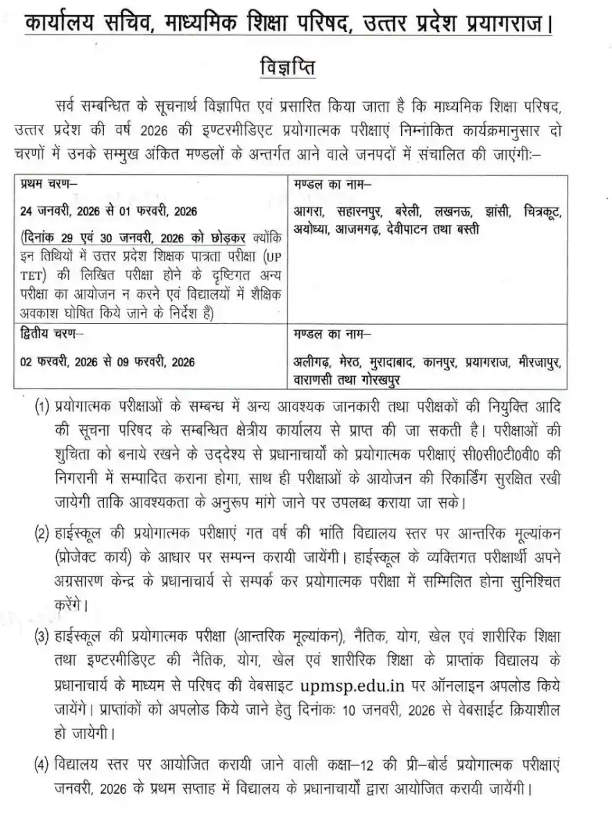उत्तर प्रदेश माध्यमिक शिक्षा परिषद दूसरे चरण की प्रैक्टिकल परीक्षा 2 फरवरी 2026 से 9 फरवरी 2026 के बीच आयोजित करेगी । इस फेज में अलीगढ़ मेरठ मुरादाबाद कानपुर प्रयागराज मिर्जापुर वाराणसी और गोरखपुर मंडल की स्कूलों में प्रैक्टिकल परीक्षा आयोजित कराई जाएगी बोर्ड ने यह निर्देश देकर साफ कर दिया है की परीक्षा प्रक्रिया पारदर्शी और अनुशासित तरीके से कराई जाय ।